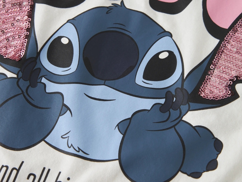 Designet har almindelig pasform, korte ærmer og en rund halsudskæring. Printet viser den populære Disney-figur Stitch sammen med teksten “Love” og små detaljer med palietter.
