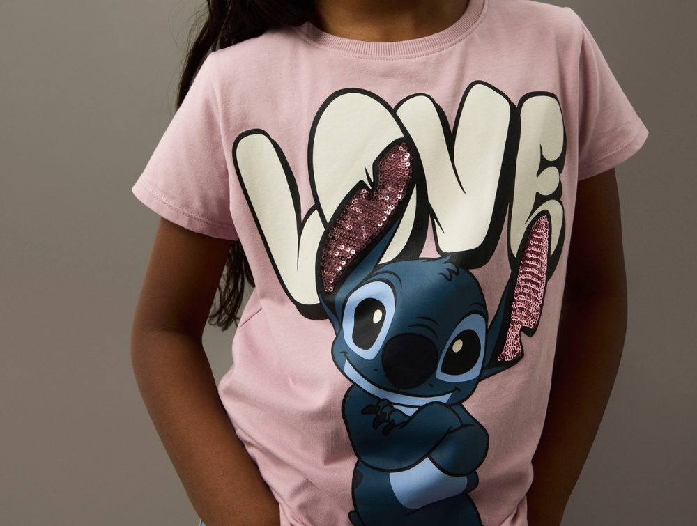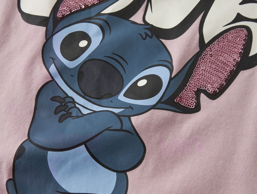 Designet har almindelig pasform, korte ærmer og en rund halsudskæring. Printet viser den populære Disney-figur Stitch sammen med teksten “Love” og små detaljer med palietter.