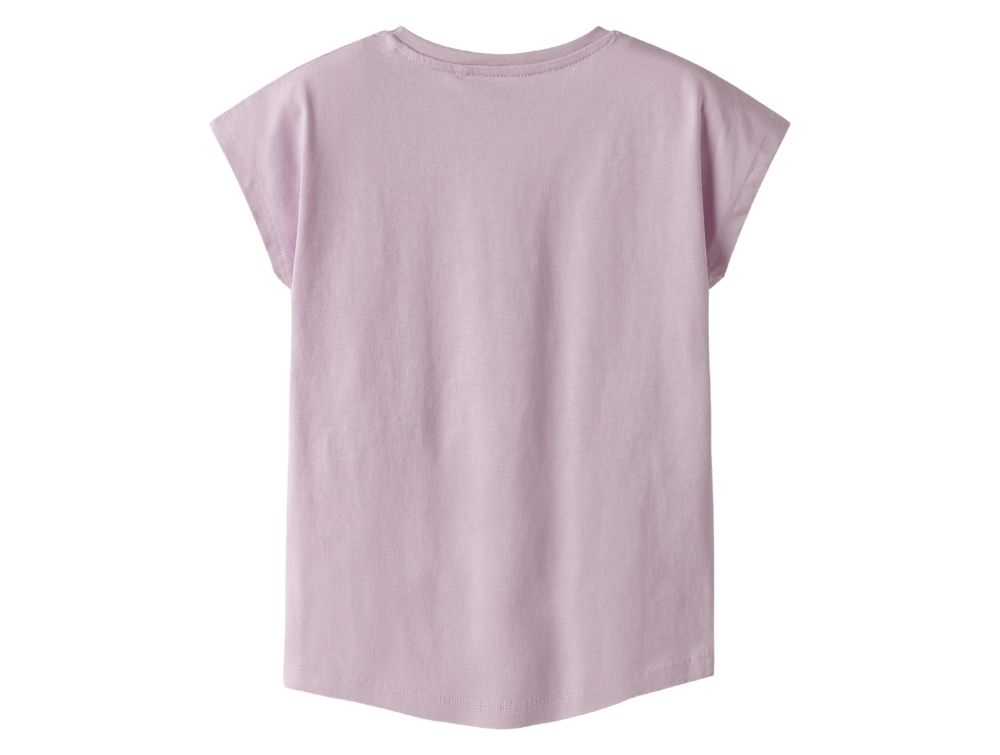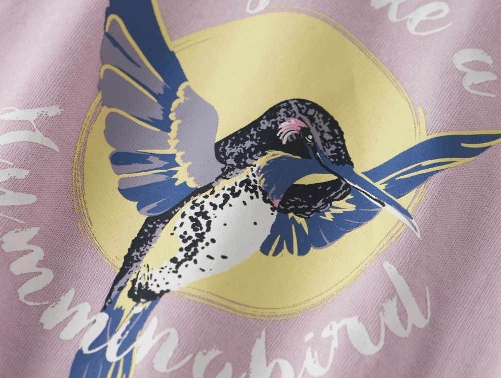 T-shirt i rosa violet nuance fra Name It med stort print af kolibri og teksten "Fly like a hummingbird".