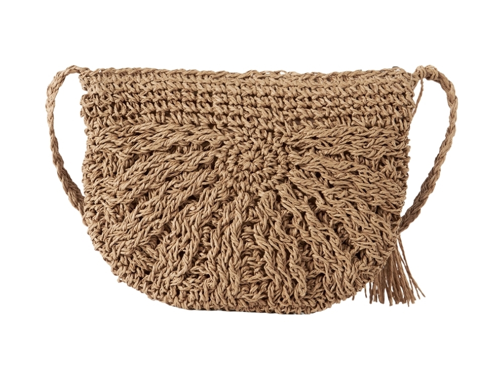 Designet har en rund form med flettet mønster og en lang skulderrem, der gør den nem at bære på tværs af kroppen. Indvendigt er tasken foret, og den dekorative kvast i siden giver et enkelt udtryk.
