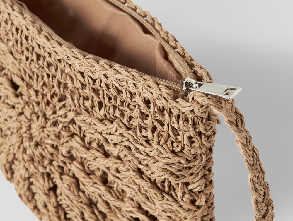 Tasken er fremstillet med papirsugerør og polyester, som giver en let og fast kvalitet. Den har en praktisk størrelse til små ejendele og lukkes med lynlås, så indholdet holdes samlet.