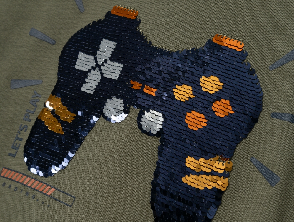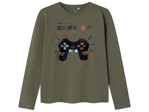 Langærmet t-shirt i farven tea leaf med cool print og spillekonsol i skinnende palietter fra Name It.