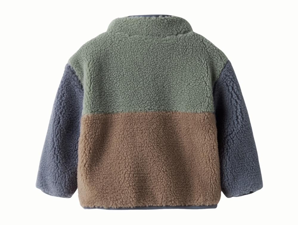 Teddy jakke i grøn nuance (chinois green) fra Name It med farveblok i brun og støvet blå.