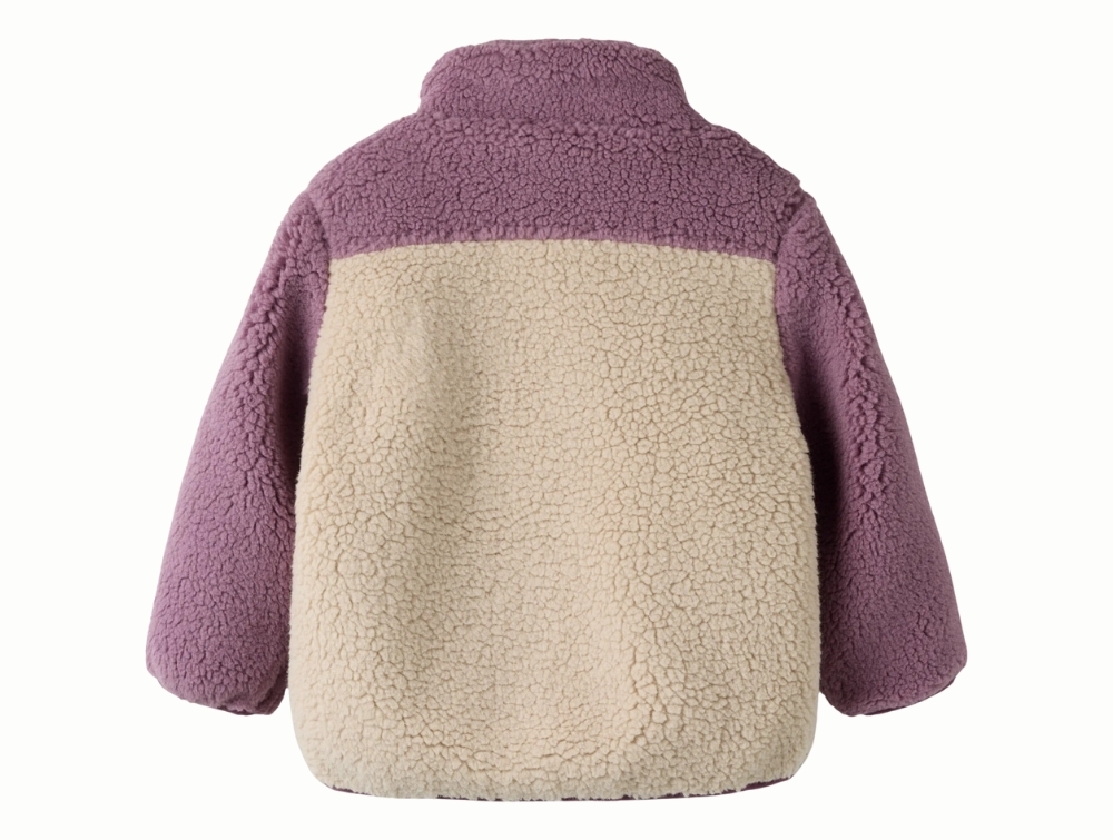 Name It teddy jakke i beige og lilla nuancer med høj hals og lynlås