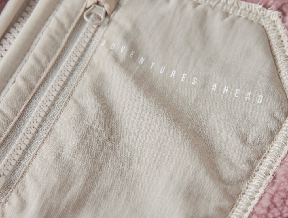 Name It teddy jakke i rosa woodrose med brystlomme foranDetalje af brystlomme med tekst Adventures Ahead på Name It teddy jakkeLynlåsdetalje på rosa teddy jakke fra Name ItName It teddy jakke woodrose vist bagfra