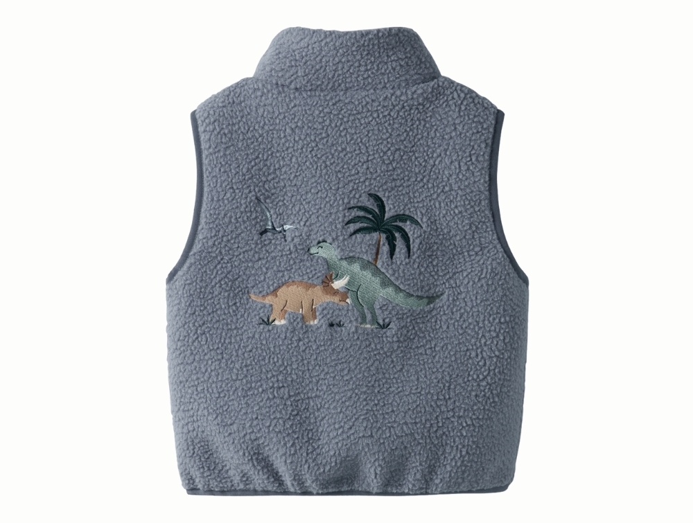 Teddyvest i blå nuance (flint stone) fra Name It med broderet dinosaur på bryst og ryg.