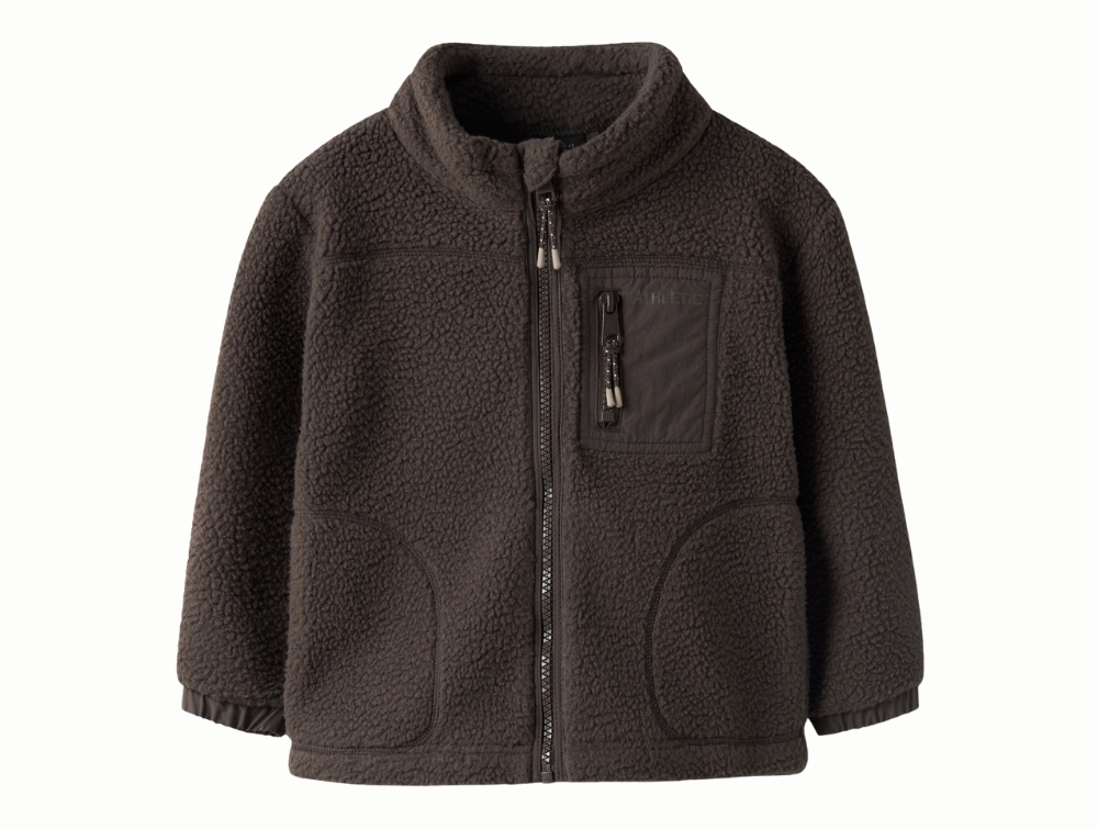 Teddyjakke i brun nuance (chocolate brown) fra Name It med blød og tekstureret overflade.