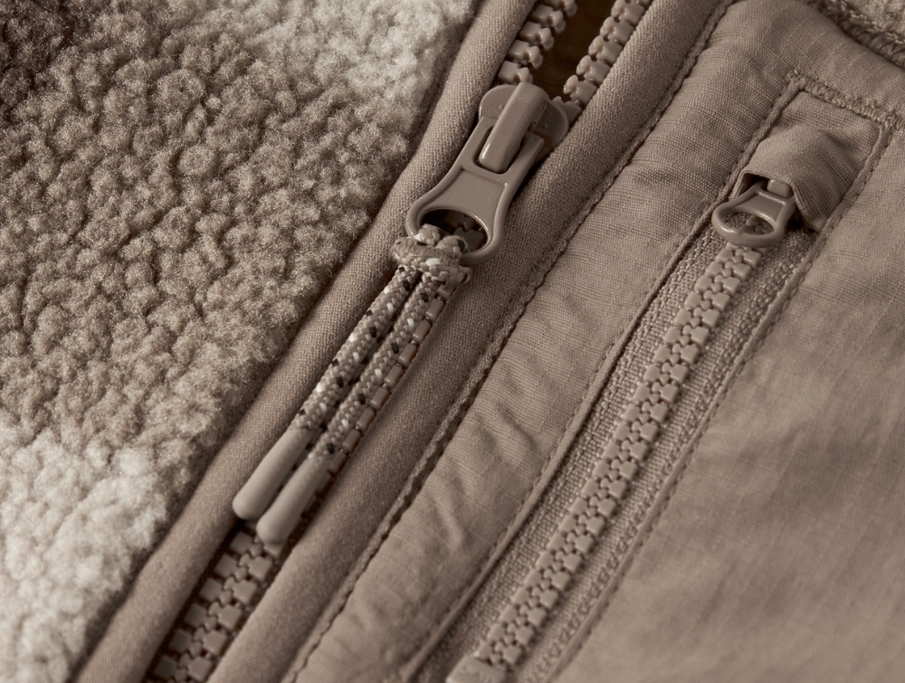 Jakken har en blød og vamset overflade med kontrastpanel på brystet samt praktisk lynlåslomme. Den ternede struktur giver et klassisk udtryk, mens teddy kvaliteten tilfører let varme.