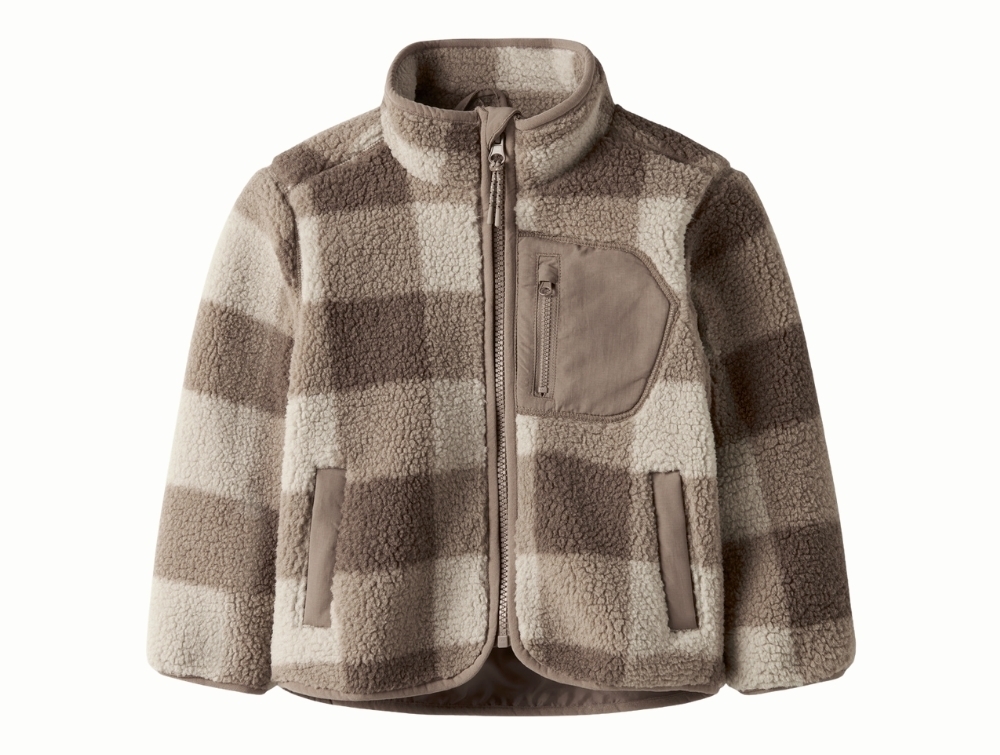 Name It teddyjakke i ternet brun nuance på barnName It teddyjakke i brun og beige ternName It teddyjakke med brystlomme og lynlåsName It teddyjakke set bagfra i ternet brun nuance