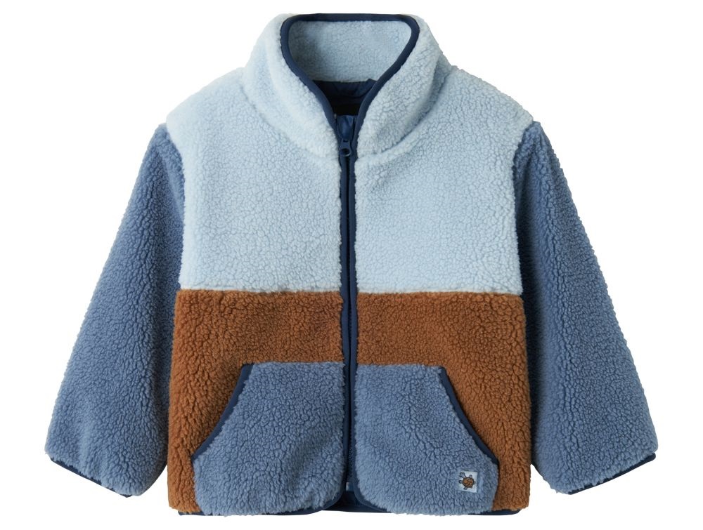 Blød og varm teddyjakke fra Name It i en plysset kvalitet med fine farvedetaljer i brune og blålige nuancer. Jakken har en afslappet pasform og fungerer perfekt som et ekstra lag på kølige dage.