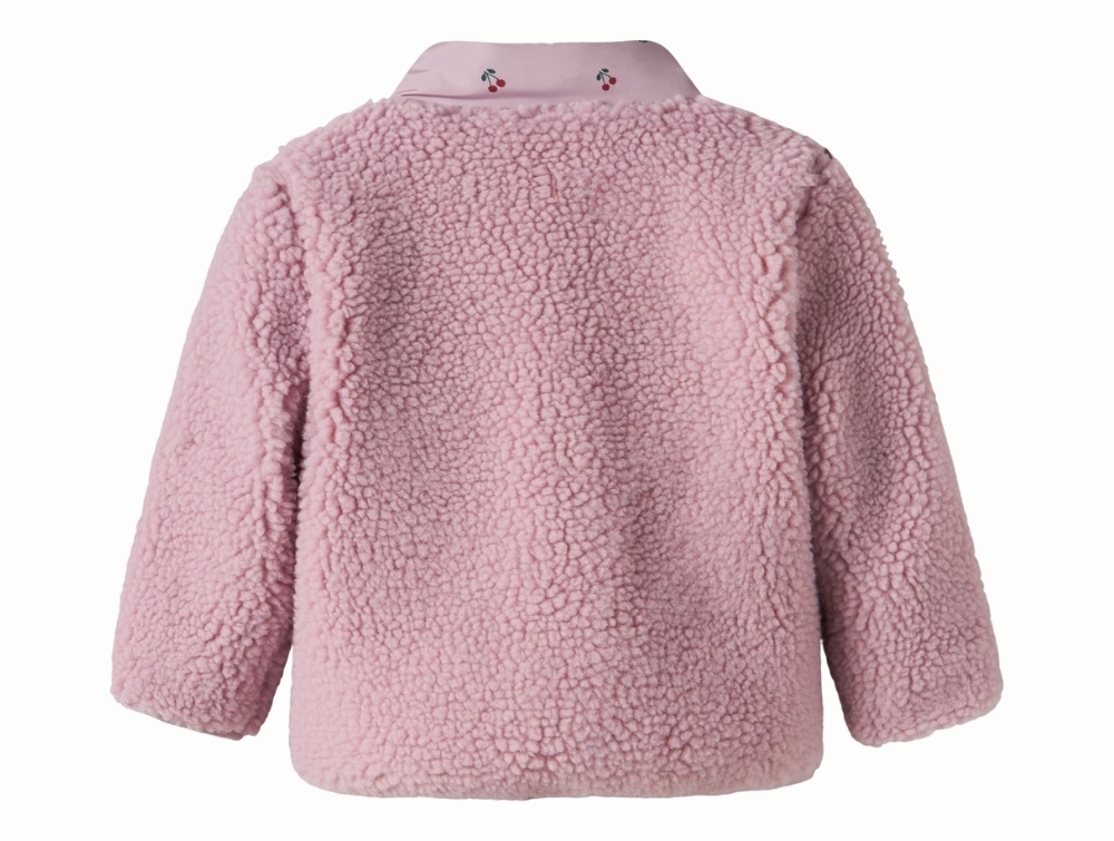 Teddyjakke i lyserød nuance (keepsake lilac) fra Name It med fint kirsebærprint øverst og blød teddy nederst.