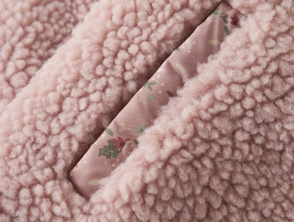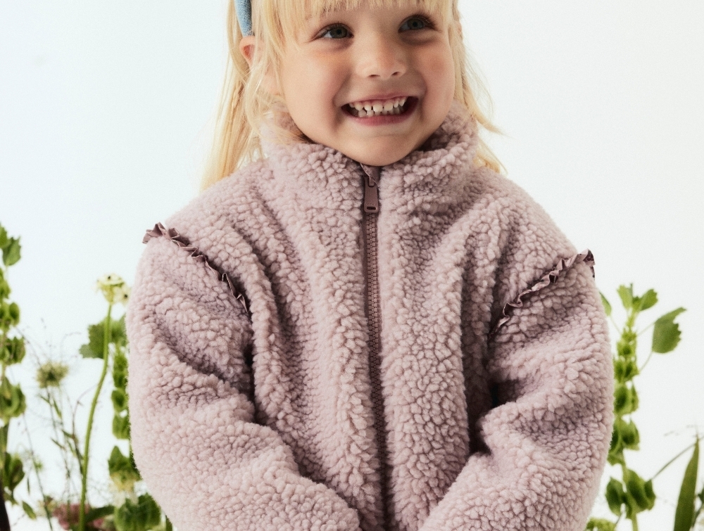 Overgangsjakken er fremstillet i blødt teddyfleece med plysset overflade, der giver varme og komfort i overgangssæsonen.