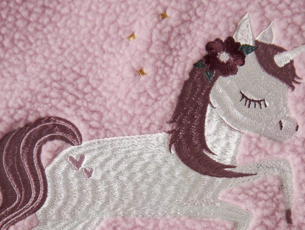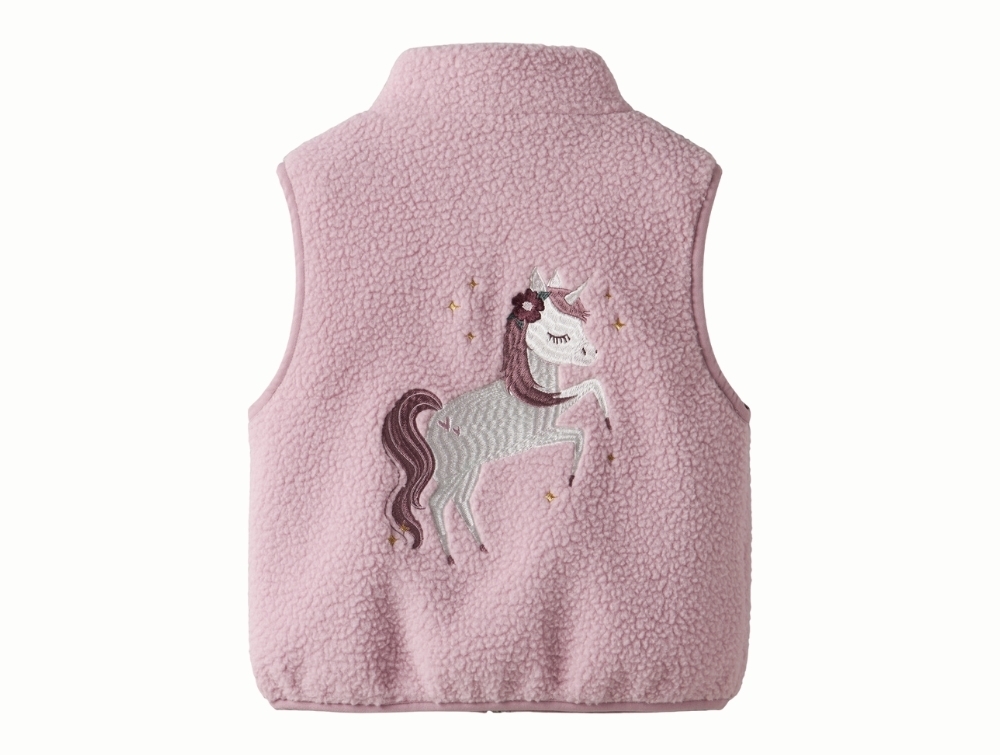 Teddyvest i lyserød nuance (keepsake lilac) fra Name It med broderet enhjørning på ryggen.