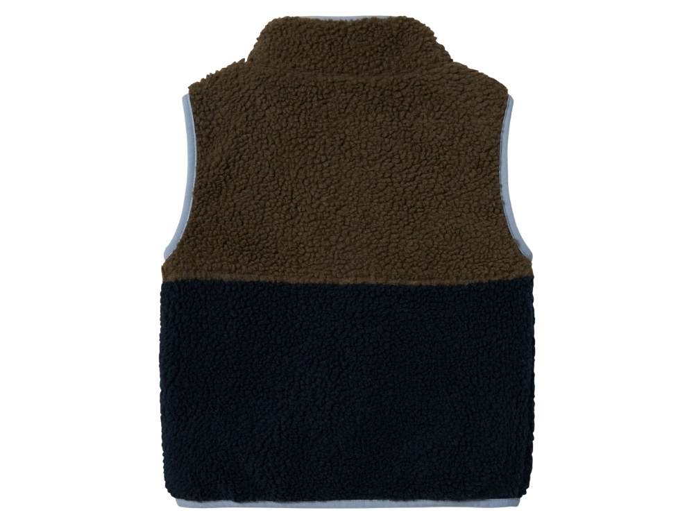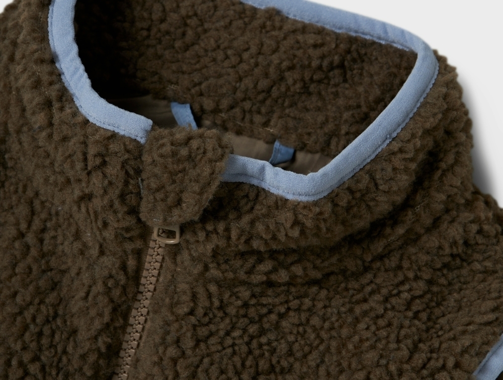 Name It teddyvest i morel og navy med høj hals forsideName It teddyvest i morel og navy bagsideDetalje af krave på Name It teddyvest i morel og navy
