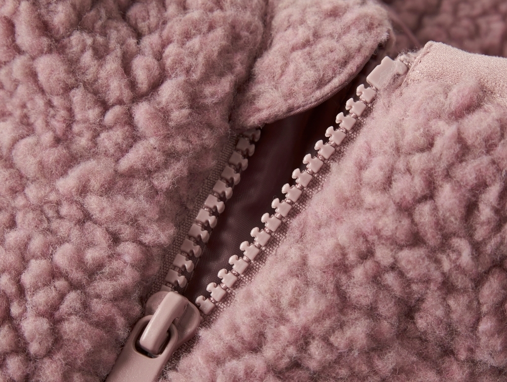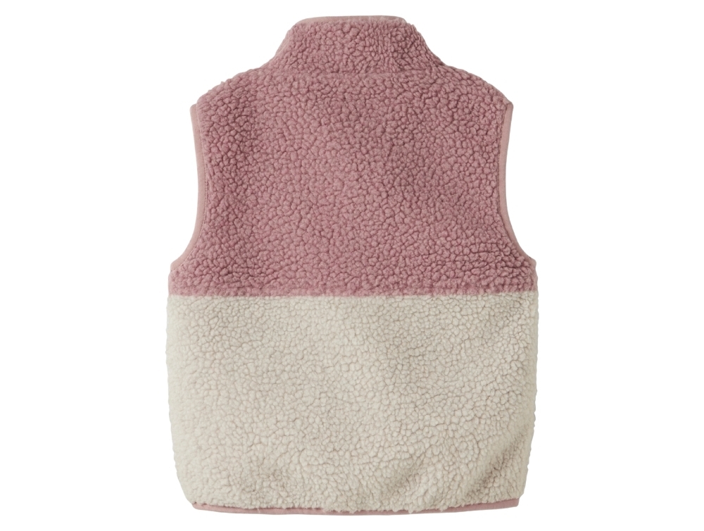 Name It teddyvest i woodrose og offwhite med høj hals forsideName It teddyvest i woodrose og offwhite bagsideDetalje af lynlås på Name It teddyvest i woodrose og offwhite