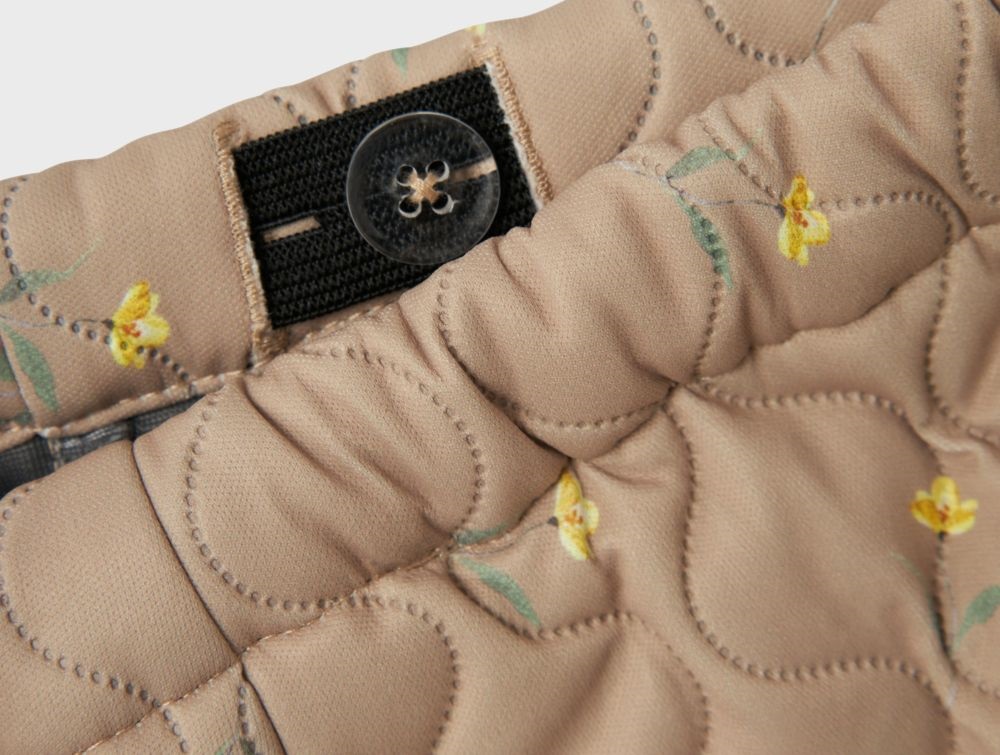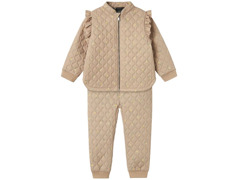 Det praktiske termosæt består af en jakke og bukser i lysebrun let vatteret materiale med et smukt print af gule blomster. Jakken lukkes med lynlås, har to lommer og feminin flæsedetalje på skuldrerne, mens bukserne har justerbar elastik i linningen for en fleksibel pasform.