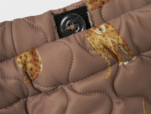 Det praktiske termosæt består af en jakke og bukser i brun, let vatteret materiale med et fint print af gyldne leoparder. Jakken lukkes med lynlås og har to lommer, mens bukserne har justerbar elastik i linningen for en fleksibel pasform.