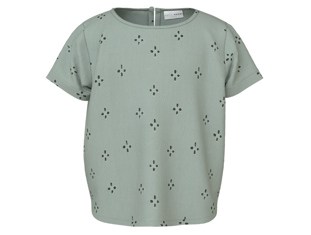 Top i grøn nuance (aqua gray) fra Name It. Let vævet kvalitet med broderet blomsterstruktur og knaplukning bagpå. Designet med korte ærmer og rund hals.