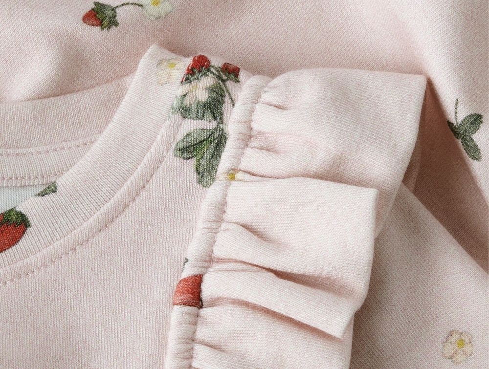 Top i lyserød (ballerina) fra Name It med fint frugt- eller bærprint og flæsedetaljer på skuldrene.