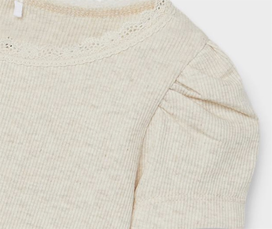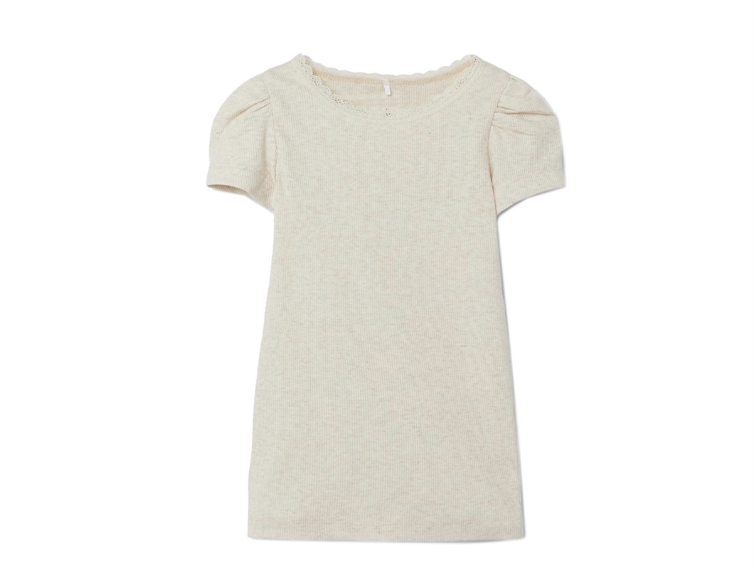 Kortærmet top i farven beige melange (peyote melange) med blonde ved halsåbning fra Name It.