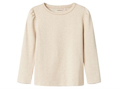 Kortærmet top i farven beige melange (peyote melange) med blonde ved halsåbning fra Name It.