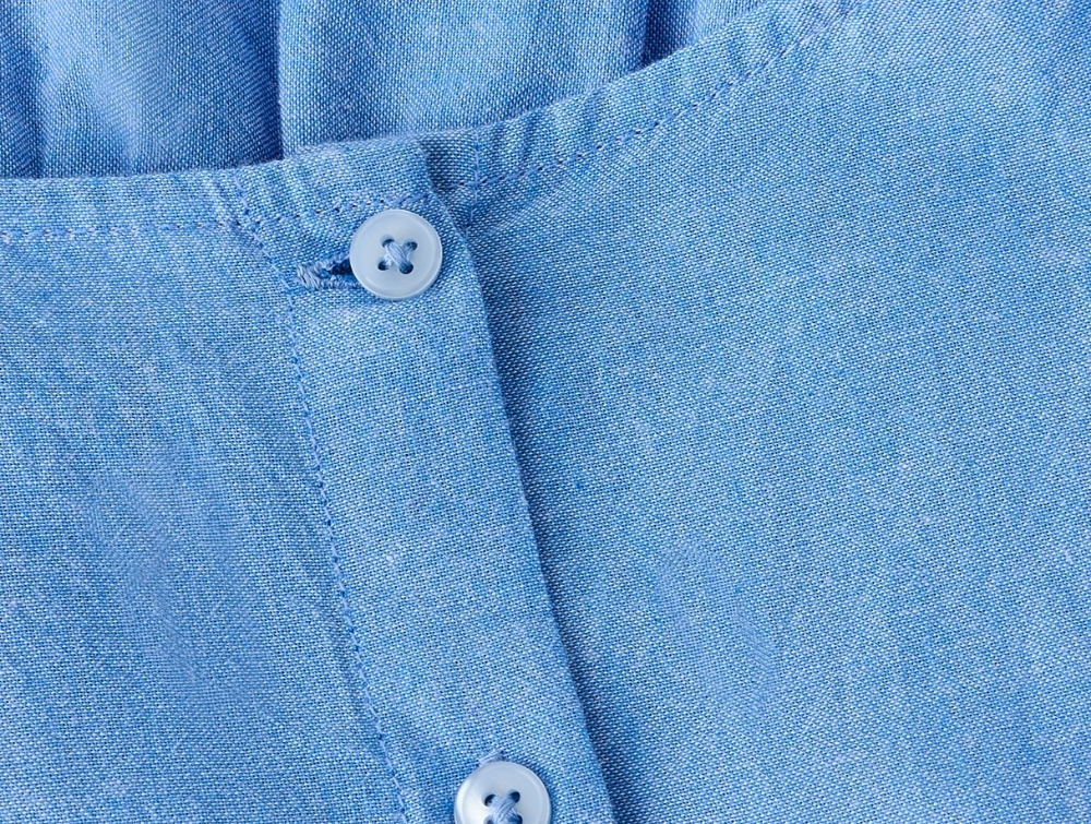 Materialet er lavet i let chambraykvalitet af bomuld, som føles blød og behagelig mod huden. Stoffet er luftigt og egner sig godt til varme dage.