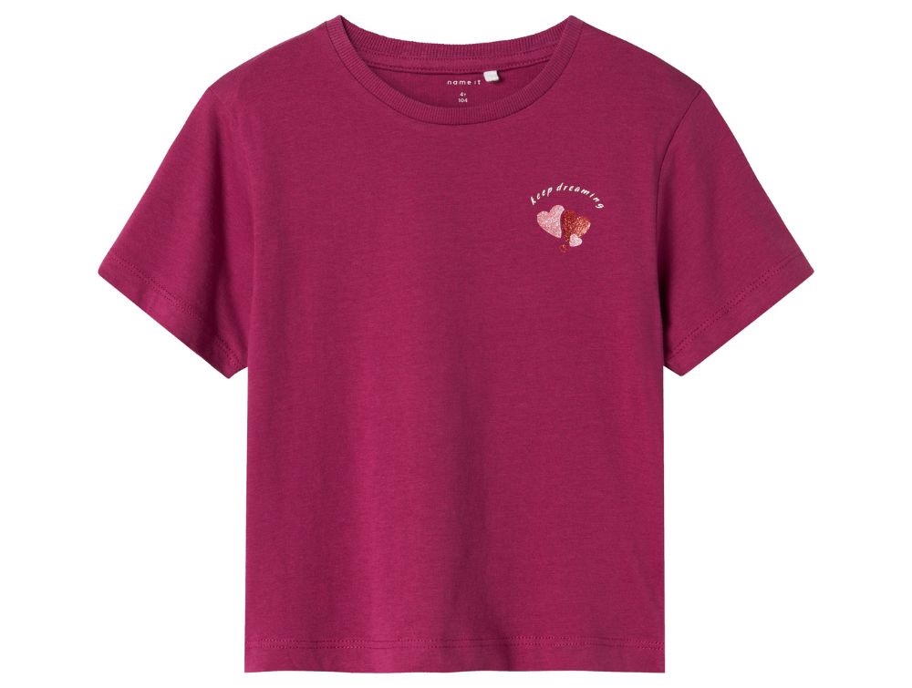 T-shirt fra Name It i farven boysenberry med små glimmerhjerter på brystet.