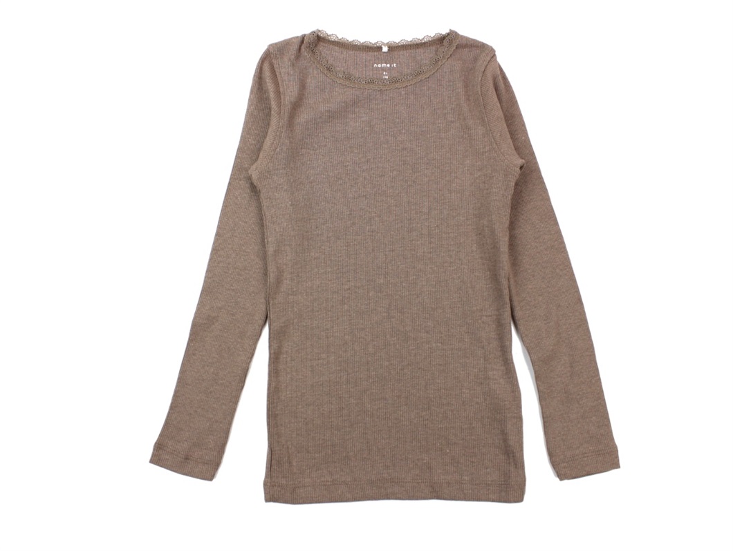 Langærmet top i farven brown lentil melange med blonde ved halsåbning fra Name It.