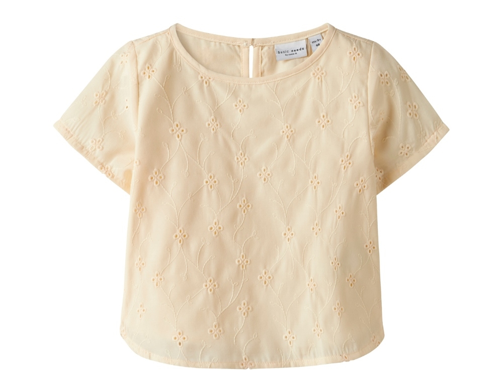Top i lys gul nuance (buttercream) fra Name It. Let vævet kvalitet med broderet blomsterstruktur og knaplukning i nakken. Designet med korte ærmer og rund hals.