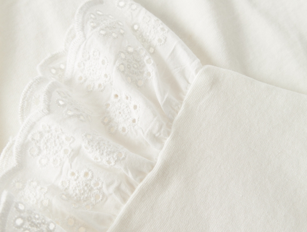 Modellen har korte flæseærmer med fine broderede detaljer og rund hals.