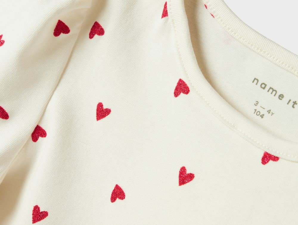 Blød og strækbar T-Shirt med lange ærmer fra Name It i en fin hvid nuance med et fint print af røde hjerter med glitter. En skøn og praktisk tilføjelse til barnets garderobe, perfekt til brug året rundt.