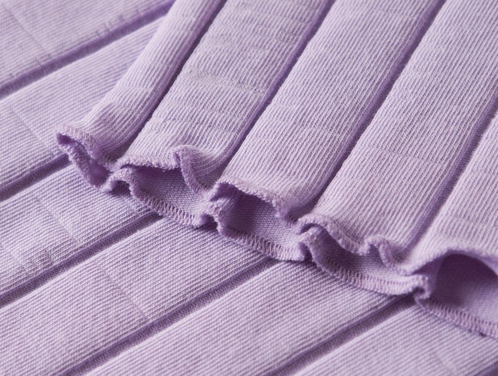 Modellen har en høj halsudskæring, korte ærmer og fine bølgekantede ærmekanter. Pasformen er tætsiddende.