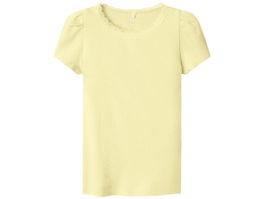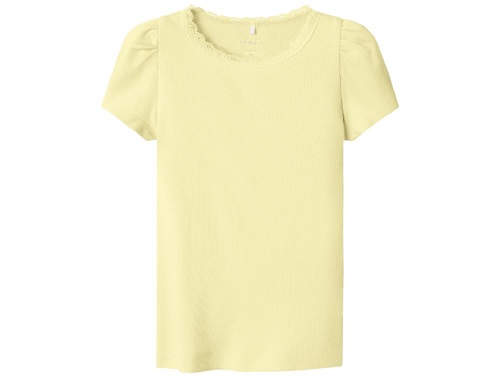 Kortærmet top i farven pastel gul (pastel yellow) med blonde ved halsåbning fra Name It.