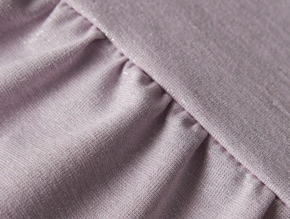 Toppen har korte ærmer, rund hals og en regulær pasform. Det lette og strækbare jerseystof har en glitrende overflade og fine flæsedetaljer, som giver et sødt udtryk.