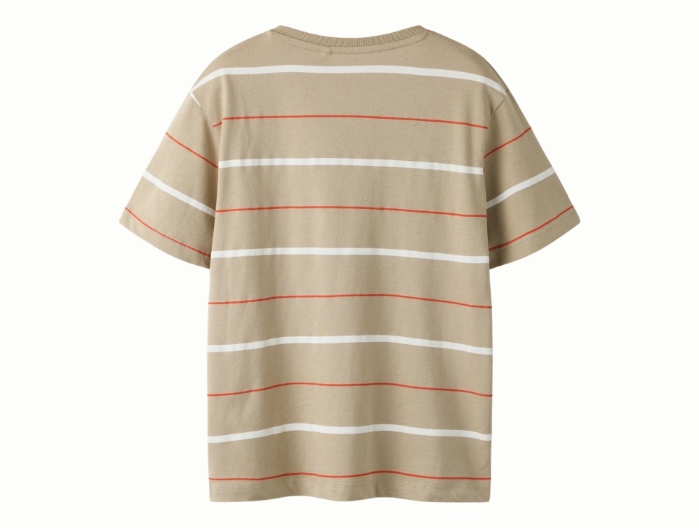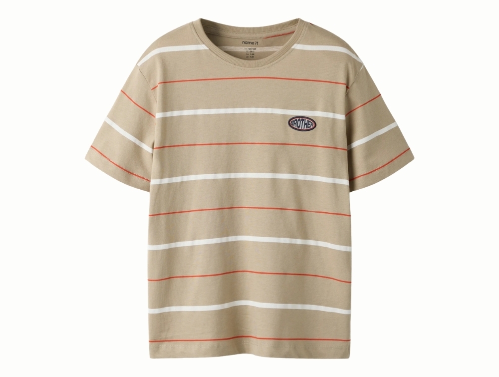 Name It t-shirt i beige nuance aluminium med hvide og orange striberName It t-shirt i beige nuance aluminium med brother broderiName It t-shirt i beige nuance aluminium med striber set bagfra