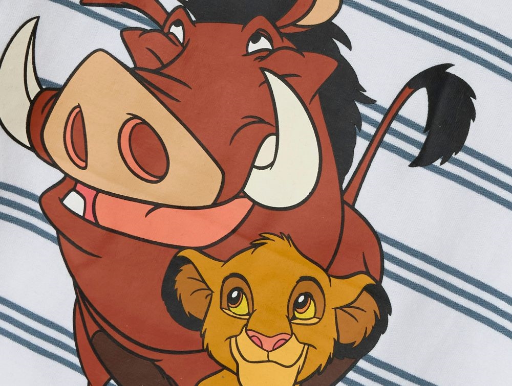 Hvid og blåstribet t-shirt fra Name It med Løvernes Konge motivNærbillede af Simba og Pumbaa motiv på Name It t-shirt