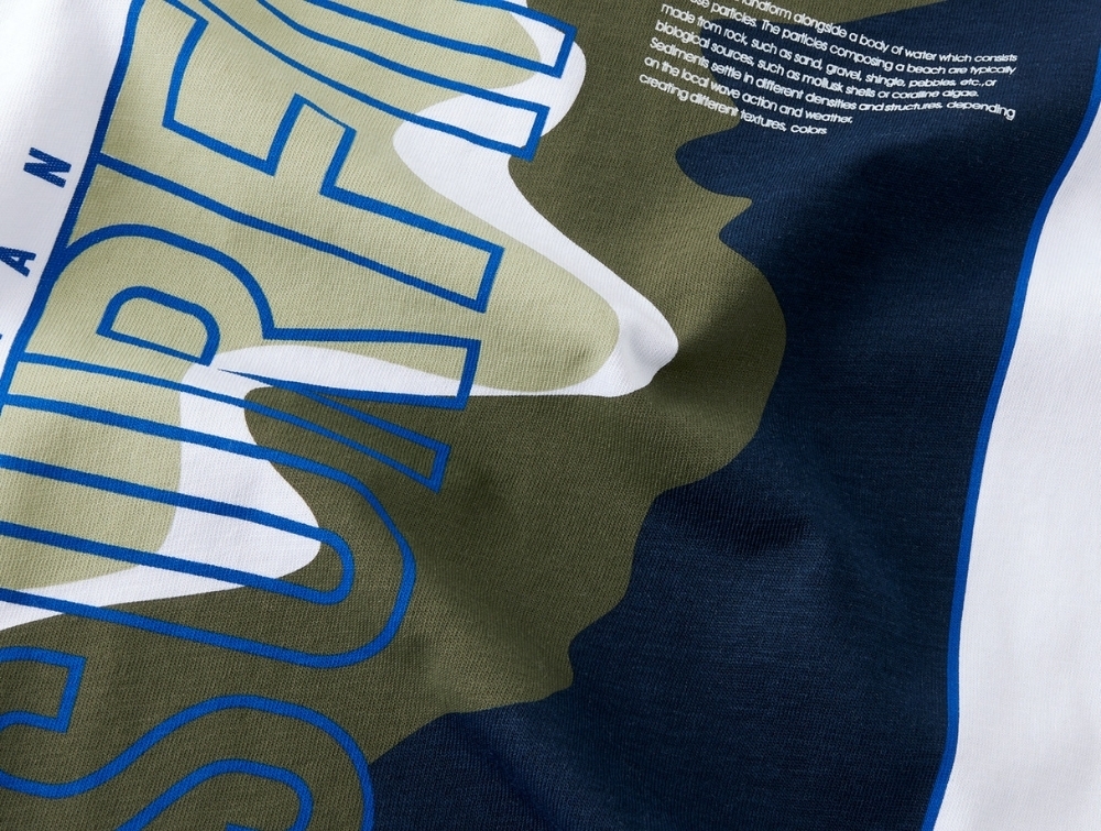 Modellen har korte ærmer, rund hals og stort grafisk print med teksten “surfing” foran.