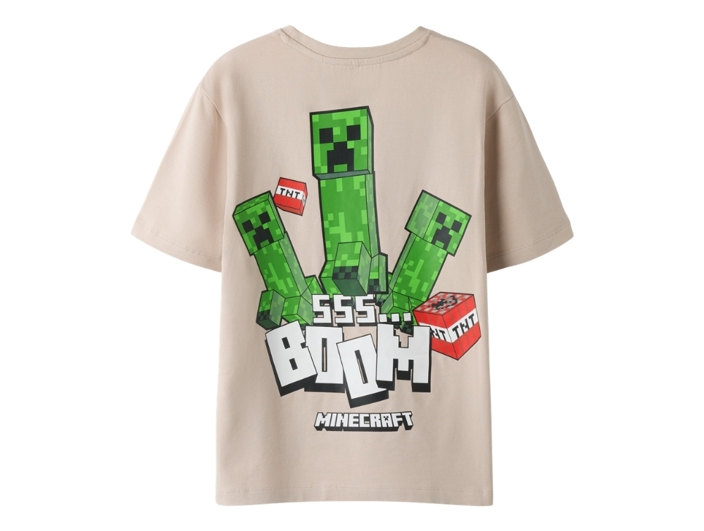 Designet har korte ærmer, rund hals og et print på fronten med figurer fra Minecraft. Minecraft er et populært spilunivers, hvor man kan bygge og udforske i en blokbaseret verden. T-shirten har almindelig pasform.