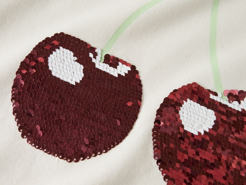 Modellen har korte ærmer, rund hals og stort kirsebærmotiv foran, hvor de røde kirsebær er lavet i pailletter, mens stilk og blad er print.