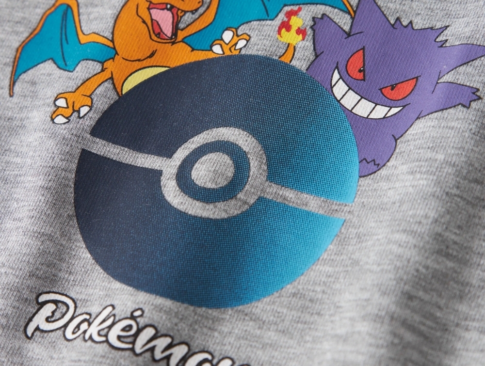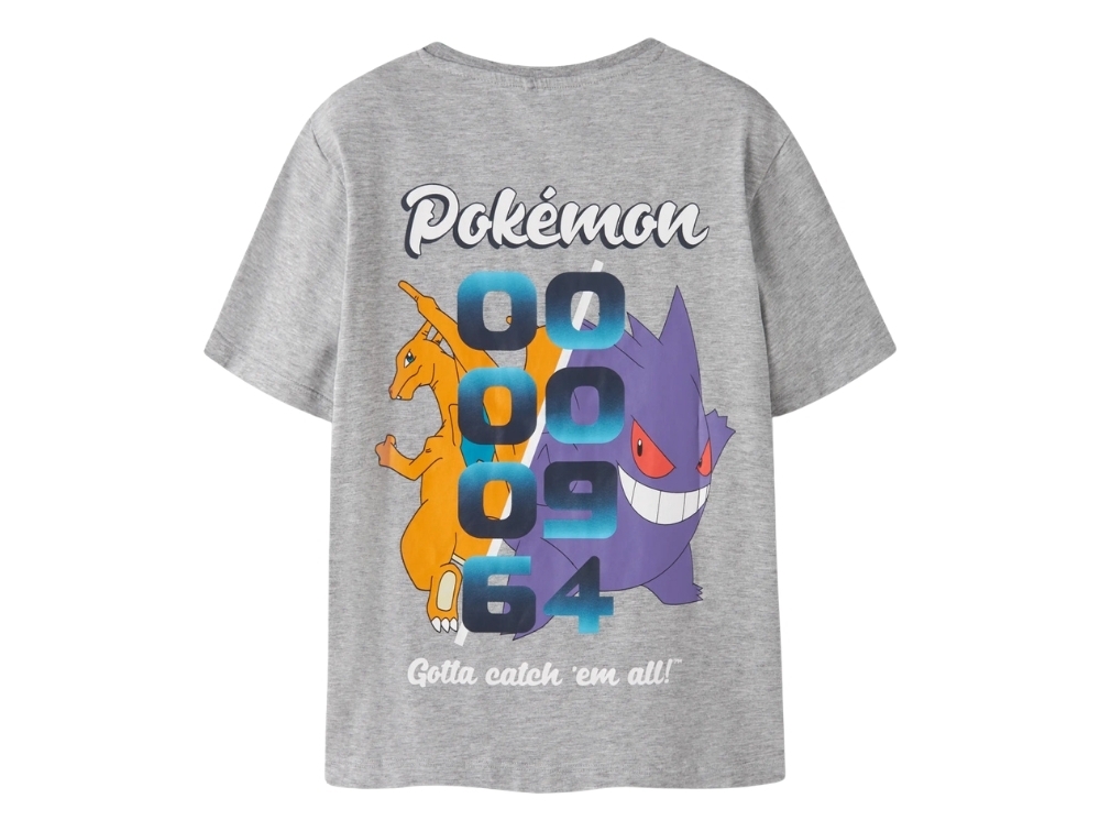Designet har korte ærmer, rund hals og print på både front og ryg med Pokémon figurer som Charizard og Gengar. Pokémon er kendt for sine farverige karakterer og eventyr, som mange børn genkender. T-shirten har almindelig pasform.