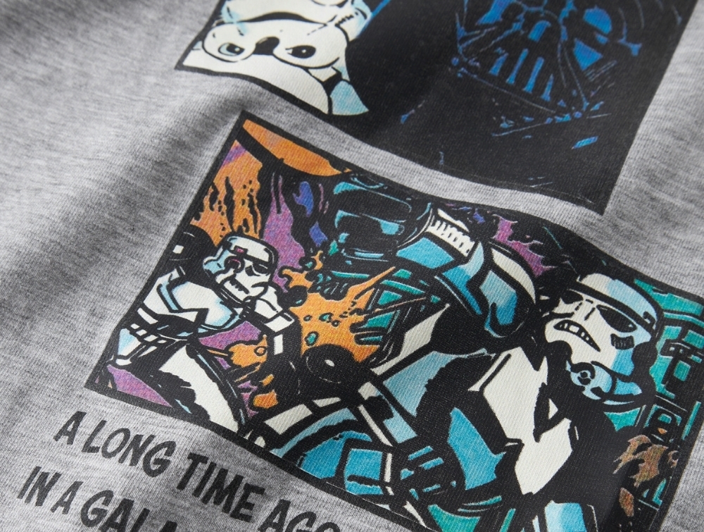 Designet har korte ærmer, rund hals og et grafisk print på fronten med motiver fra Star Wars universet. Star Wars er kendt for sine ikoniske karakterer og fortællinger om rumkampe og helte. T-shirten har almindelig pasform.