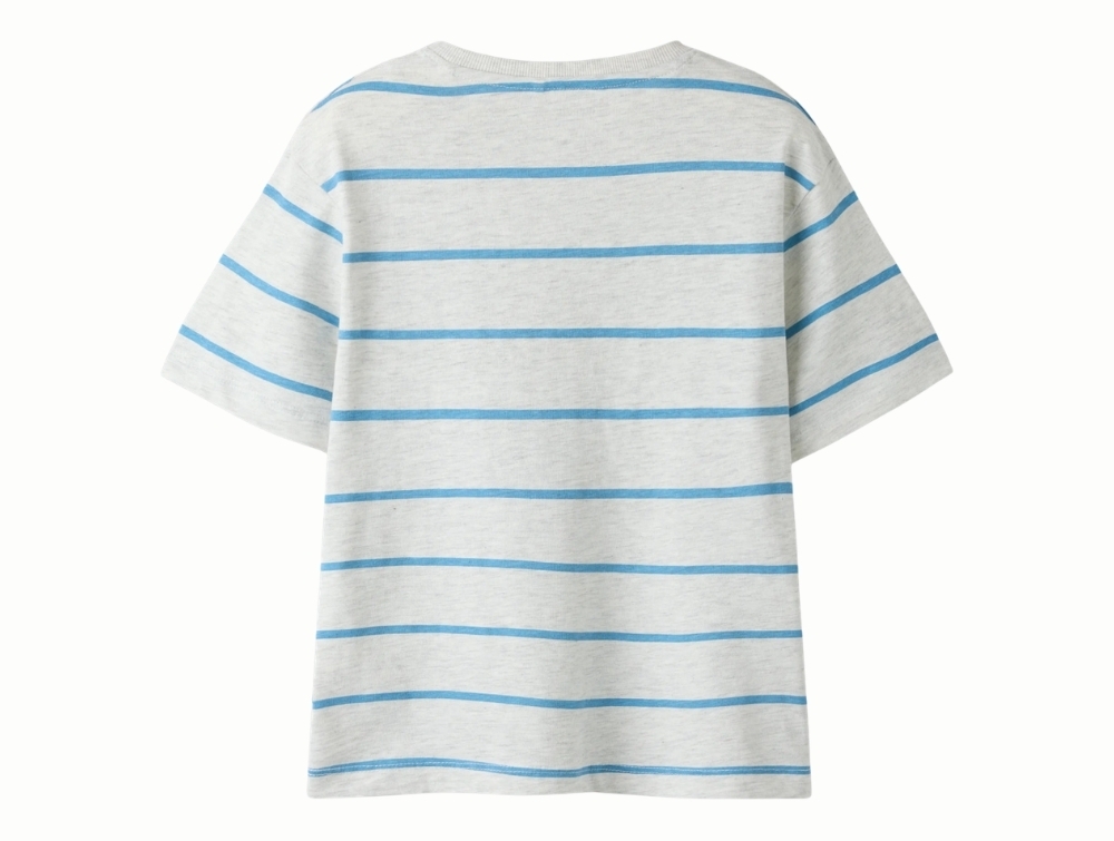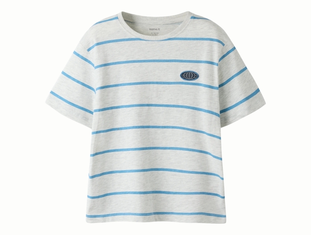 Name It t-shirt i lysegrå nuance light grey melange med blå striberName It t-shirt i lysegrå nuance light grey melange med broderet badgeName It t-shirt i lysegrå nuance light grey melange med striber set bagfra