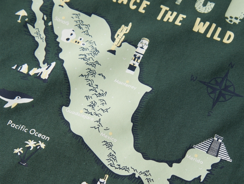Designet har korte ærmer og rund hals samt print med kort og tekst fra Mexico både foran og bagpå. Motivet med “Mexico – Embrace the Wild” giver et grafisk udtryk.