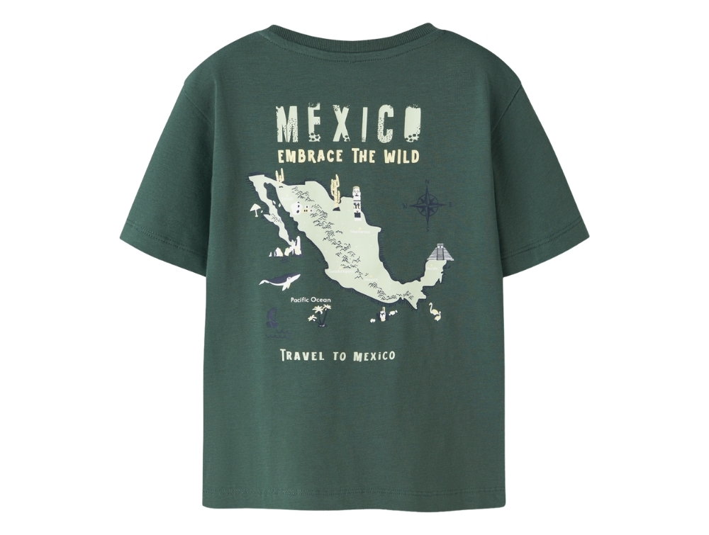 T-shirt i grøn nuance (Garden Topiary) fra Name It med Mexico print på bryst og ryg.