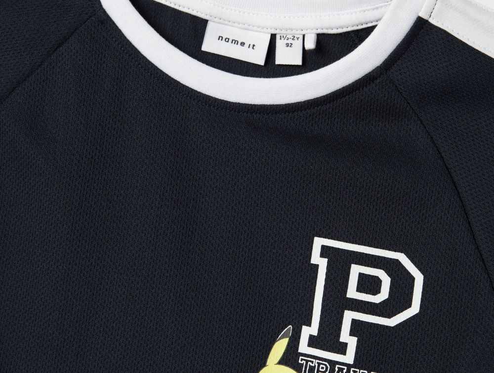 T-shirt fra Name It i navy blazer med Pikachu-print og hvide sporty detaljer.