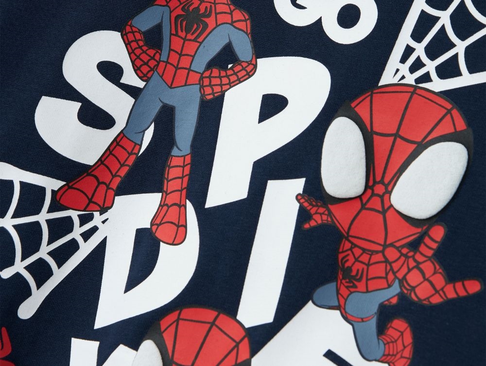 Mørkeblå t-shirt fra Name It med Spider-Man motiv og tekstNærbillede af Spider-Man tryk med puff-effekt på mørkeblå t-shirt