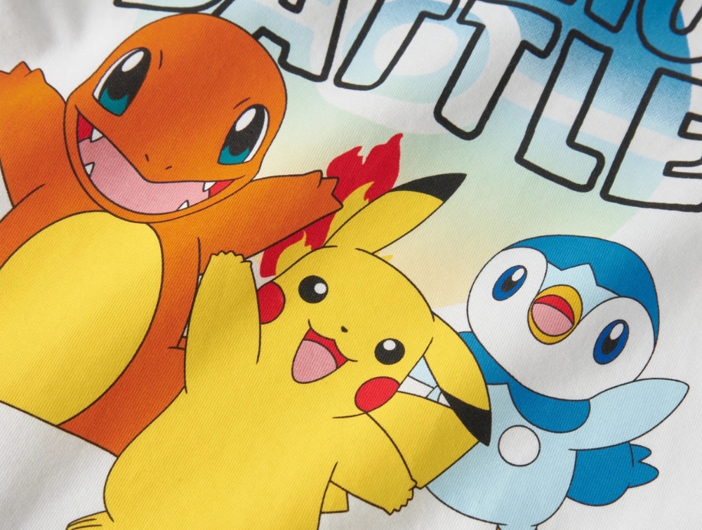 Designet har korte ærmer og rund hals samt print med Pokémon-figurer som Pikachu, Charmander og Piplup. Pokémon er et populært univers med fokus på venskab og eventyr.