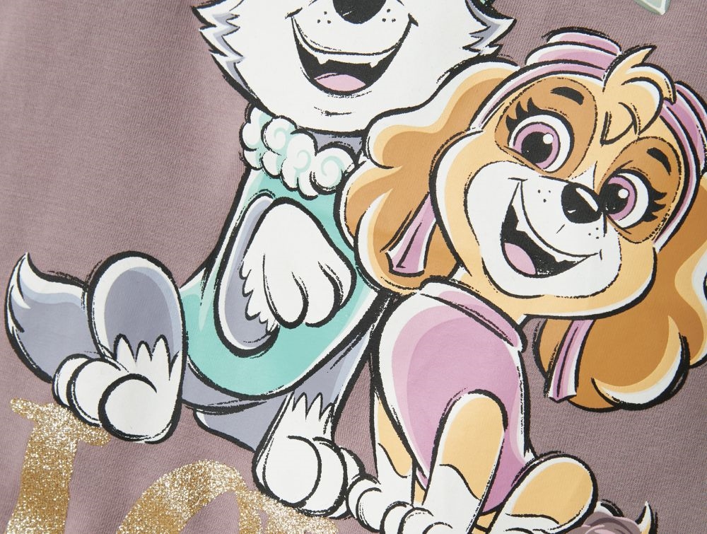 Lilla Paw Patrol t-shirt fra Name It med glitter og pufærmer