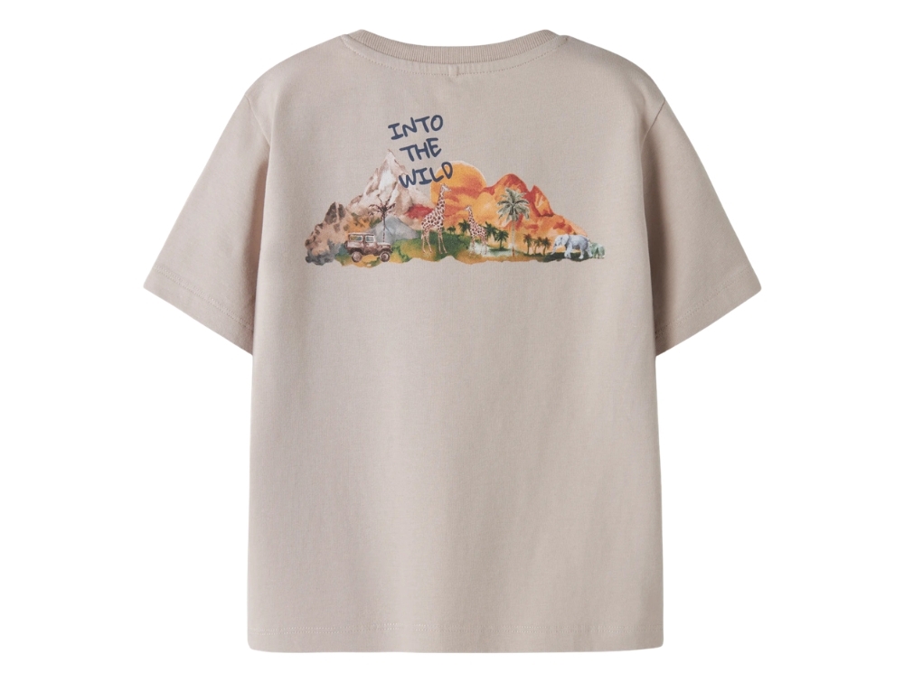 T-shirt i beige nuance (Chateau Gray) fra Name It med safari print på bryst og ryg.