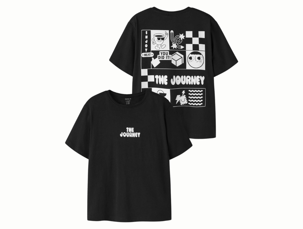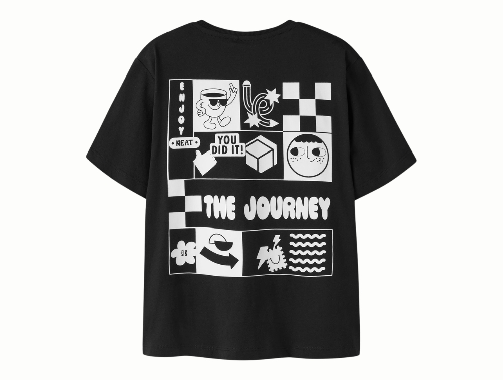 T-shirt i sort nuance fra Name It med lille “The Journey” tekstprint foran og stort grafisk print bagpå.